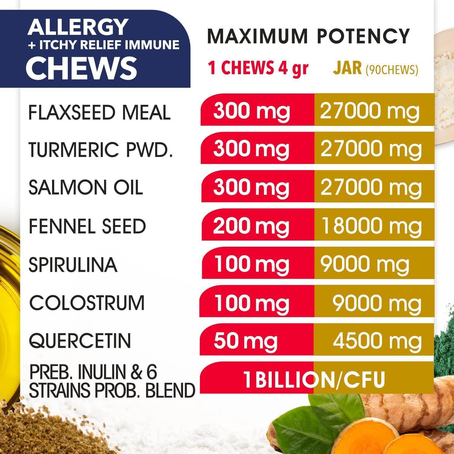 2.Dog Allergy Relief Formula The ingredients in our itch relief chews for dogs include colostrum, salmon oil, flax seed, spirulina and probiotics. Our dog immune supplement contains antihistamine and decongestant properties that quickly help relieve your pup's discomfort during seasonal and food allergies
