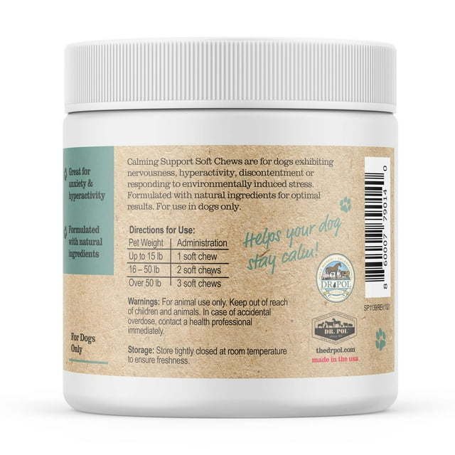 About Dr. Pol Calming Chews for Dogs Puppy anxiety is a normal part of life, but if your furry friend is shaking in their boots, they may need some relaxation assistance. Luckily, Dr. Pol Calming Chews for Dogs are formulated to help with just that. From travel nervousness to separation anxiety, there are countless things that can trigger your pet's unease. A simple, tasty anti-anxiety and melatonin dog treat can assist in relaxation and sleep, keeping your pet blissful and calm. These dog calming treats utilize not only the sleep chemical melatonin but also four other active ingredients to help calm their mind and body. Botanicals including passion flower and chamomile are known for their relaxing properties, and they work alongside amino acid L-Tryptophan to help quiet anxiety and hyperactivity. For a dog melatonin is a fantastic sleep aid as it works with the body naturally. As well, these dog chews can function as puppy calming treats, as they are safe for pups 12 weeks and older. When you're looking for dog stress and anxiety relief to help stop dog barking, quiet anxiety, or ease travel nerves, reach for a well-rounded supplement with botanicals, amino acids, and melatonin for a balanced approach that is sure to help. Give your pup the gift of calm with Dr. Pol Calming Chews for Dogs!