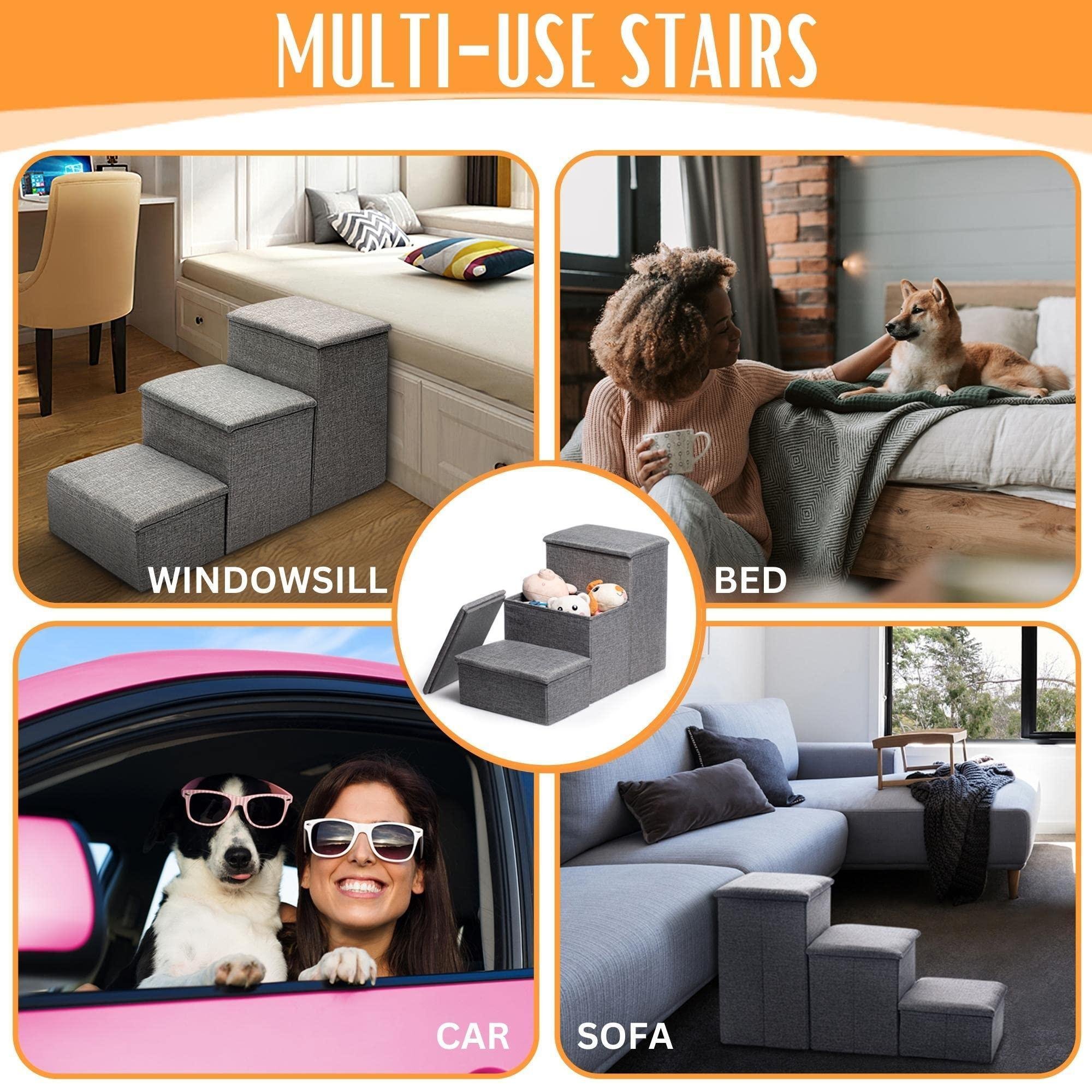1.Portable Pet Stairs for Dogs to Get on Bed- These doggy steps work great as dog steps for high beds, couches, cars or even use as a dog window perch for them to look outside.