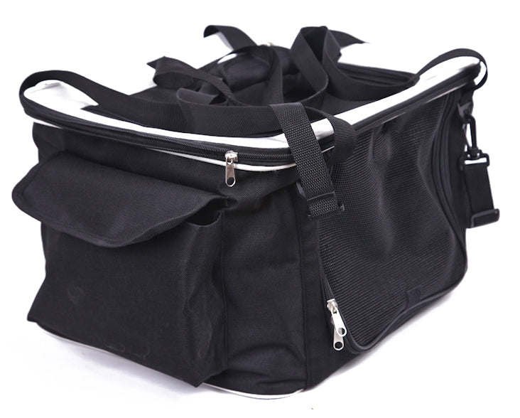 The Pet Life Lightweight Collapsible Wire-Folding Collapsible Dog Car Seat and Convertible Pet Dog Carrier is composed of High-Grade Tough Nylon Fabrics. This Dog Carseat Carrier Features a Zippered Mesh Sunroof along the top for Pet Placement and the Top Nylon portion entirely Zips off. Additionally this Dog Carseat Features a Dual Sided Nylon Velcro Pouch. The Car-Seat Buckles easily strap-around the Car Seat for Safety and Support. This Dog Carseat Zips Open from Front to Back and Features a Built-In Leash or Harness Holder so your pet can't escape and is furthermore Collapsible and Folds to 3 inches narrow via the Collapsible Wire Folding Bars. This Multi-Purpose Car Seat can also be used also a Travel Dog Carrier as well. These car seats are extremely essential while driving your pet in any car by further decreasing any and all car related injuries that occur every second each day. Many Pet Owners don't tend to focus on the protection of our Pets while traveling in a vehicle and an item of such should be an essential requirement for all Dog Owners alike. This Dog Carseat collapses and Folds to 4 inches thin and can be carried by the included Handle Bar.