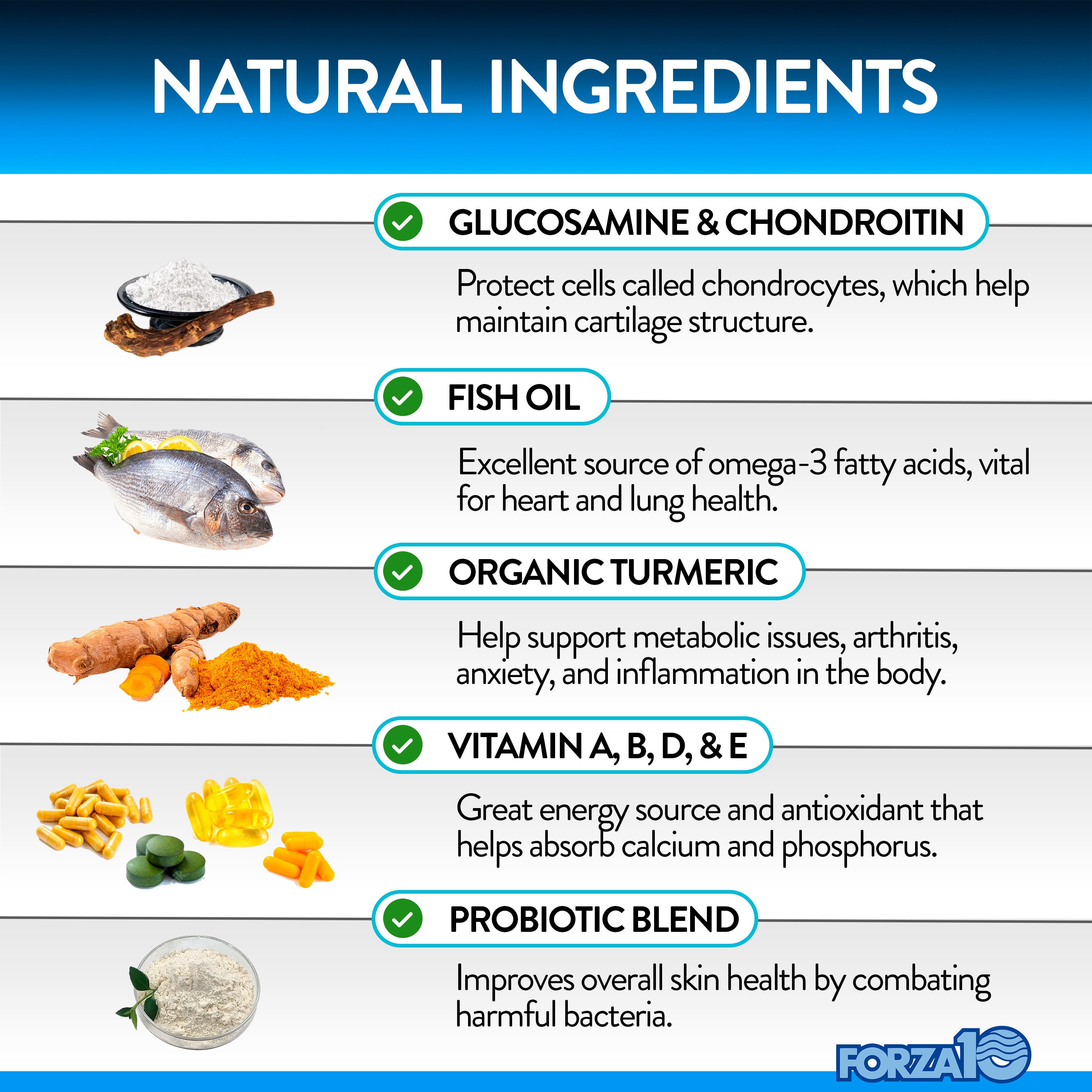 Glucosamine HCl (Shellfish Source), Chondroitin Sulfate (Porcine Source), Organic Turmeric, Fish Oil (Sardine, Mackerel, Herring, Anchovy), Multivitamin Blend (Vitamin A, Vitamin D3, Niacin, d-Alpha tocopherol acetate (Vitamin E), Thiamin (B1), Pantothenic Acid, Pyridoxine (B6), Riboflavin (B2), Folic Acid, Biotin, Vitamin B-12) Probiotic Blend (Lactococcus lactis, Lactobacillus plantarum, Lactobacillus acidophilus, Lactobacillus brevis, Bifidobacterium bifidum, Lactobacillus fermentum and Enterococcus faecium, Brewer's Yeast, Citric Acid, Coconut Glycerin, Flaxseed, Mixed Tocopherols, Oat Flour, Palm Fruit Oil, Peanut Butter, Peanut Flour, Powdered Cellulose, Rosemary Extract, Sorbic Acid, Sunflower Lecithin.