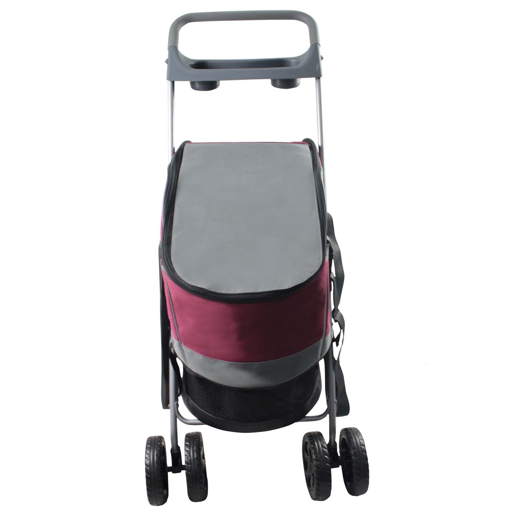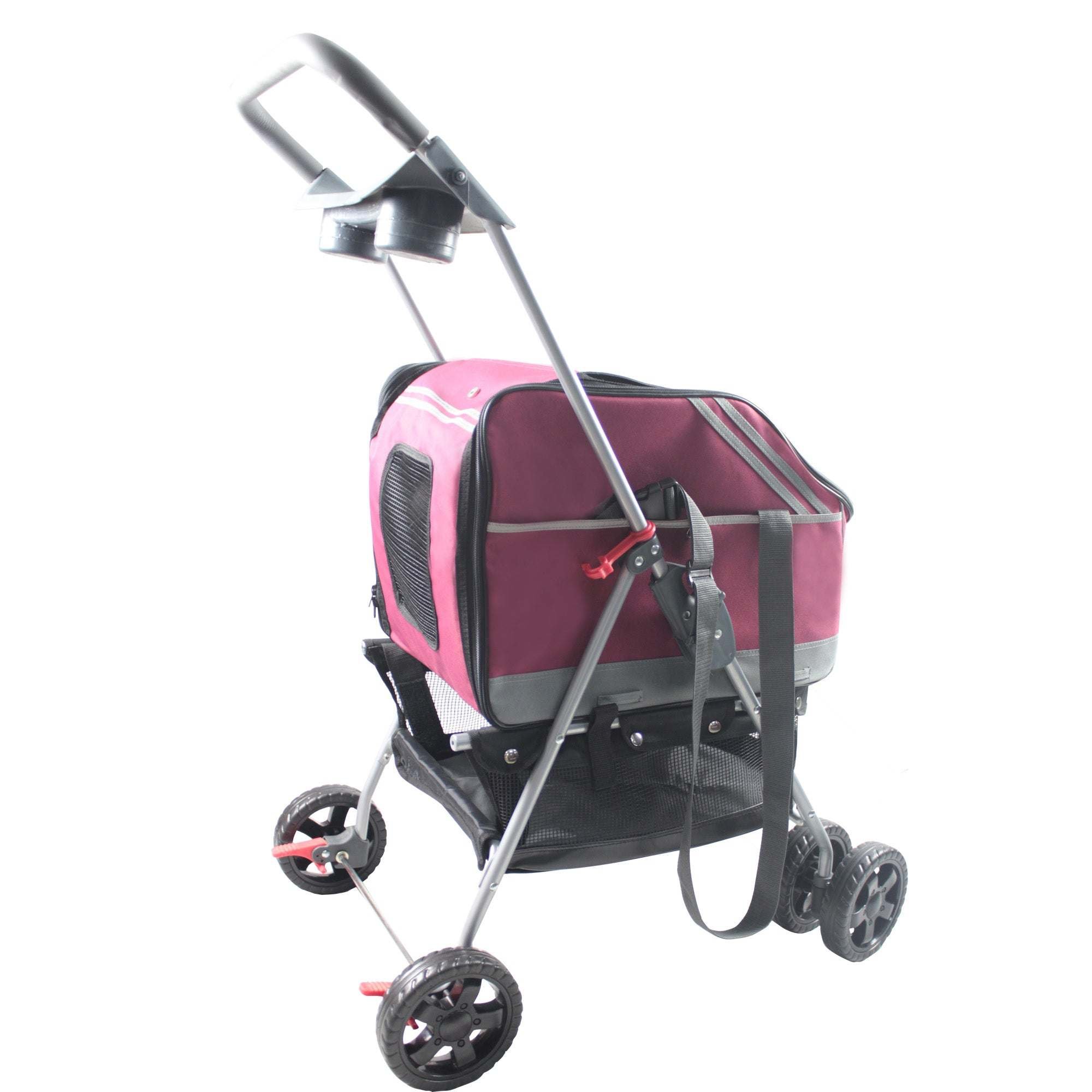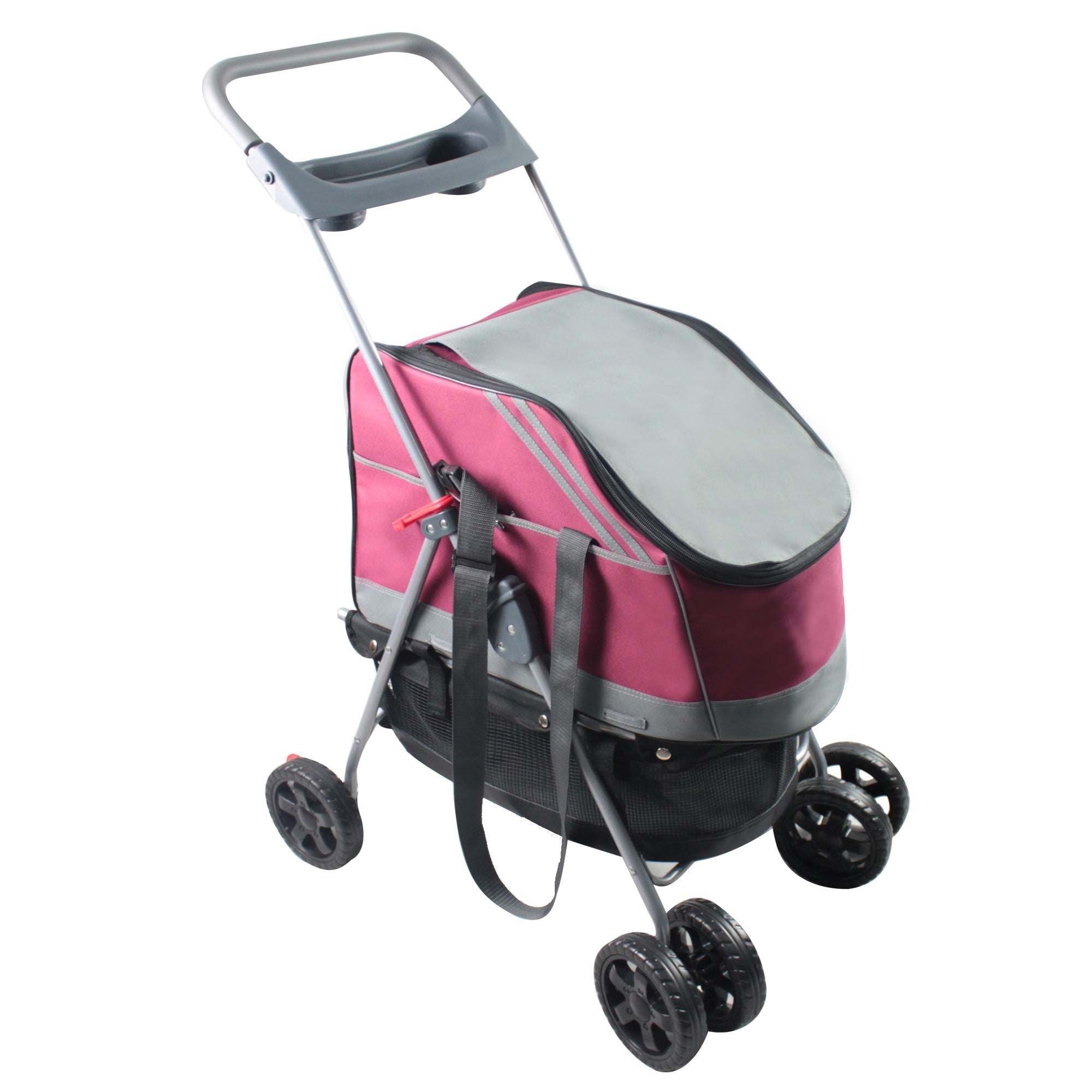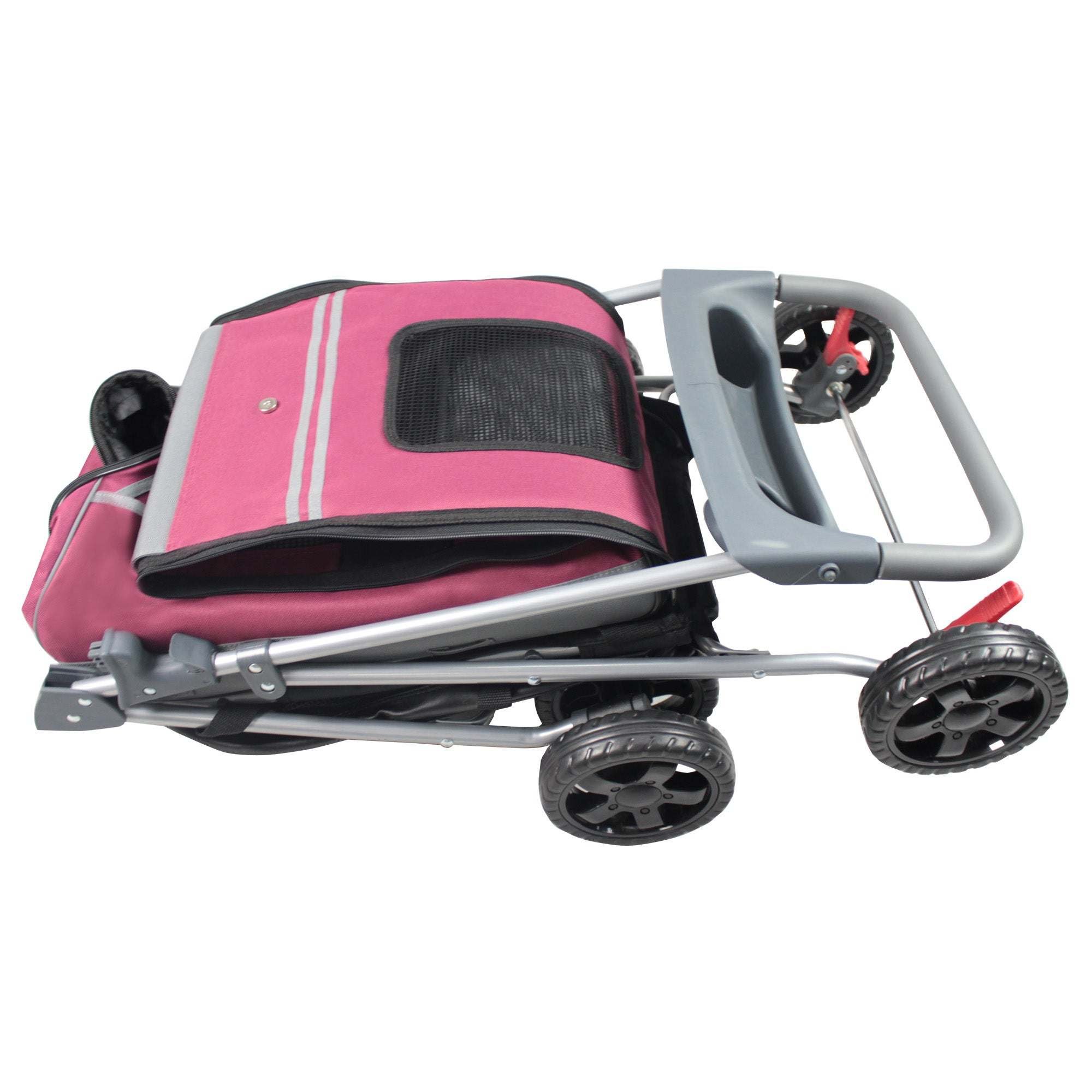 The Pet Life 'All Surface' Multi-Purposeful 3-in-1 Dog Stroller, Dog Carrier and Dog Car seat is composed of High-Grade Heavy Duty Ballistic Nylon Fabrics and Tough PVC Handle-Bars. This enables it to stroll up to 70 Lbs of weight. This Dog Stroller Features High-Quality Dual Front Rubberized Wheels built for traction resulting in a comfortable walk. A Built-In Bottom Tray saves you from carrying an extra bag for additional items. This Pet Stroller Features a Zip-Off Mesh and Nylon and a Dual Bottle Tray within the Push Handle bar. You can quickly convert it into a Pet Carrier or Car Seat by easily un-strapping the Nylon component within the Dog Stroller. The Car Seat functionality sits onto any car seat and fastens to any and all Vehicle Seat Belts. These car seats are extremely essential in preventing any car injury. This piece is the Ultimate Safety accessory for your pet. Included inside the Pet Stroller is a Built-In Leash and Harness connector. The Handle Bars Fold and Collapse to 6 inches thin making it easy to store.
