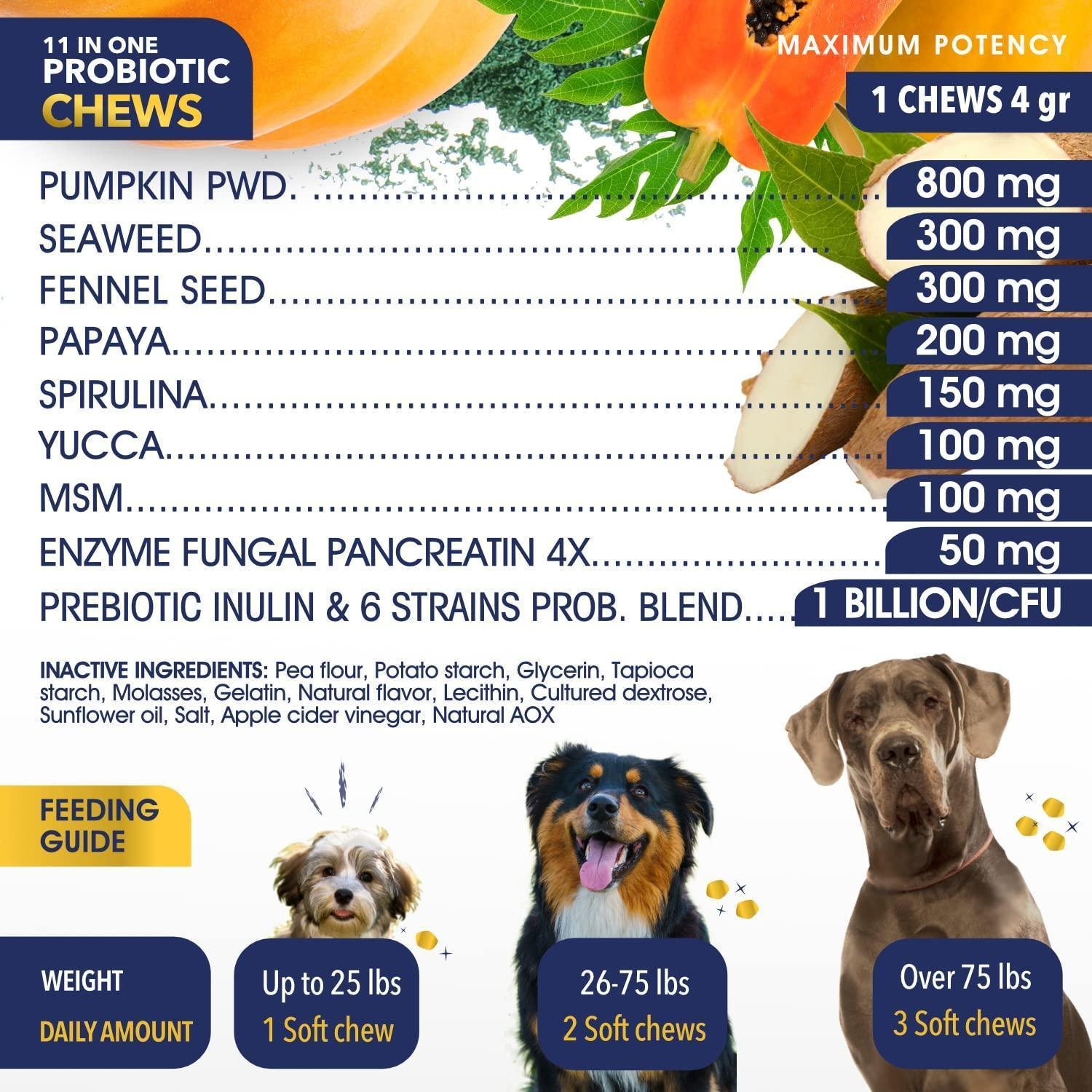 1.Our 11 in ONE probiotics for dogs & puppies contain: 6 strains Probiotic Blend ( 1 Billion/CFU), Enzyme Blend, Fungal Pancreatin, Papaya, Pumpkin, Seaweed, MSM, Fennel Seed, Spirulina, Yucca which help control seasonal allergies,itchy skin, support digestive and immune system.